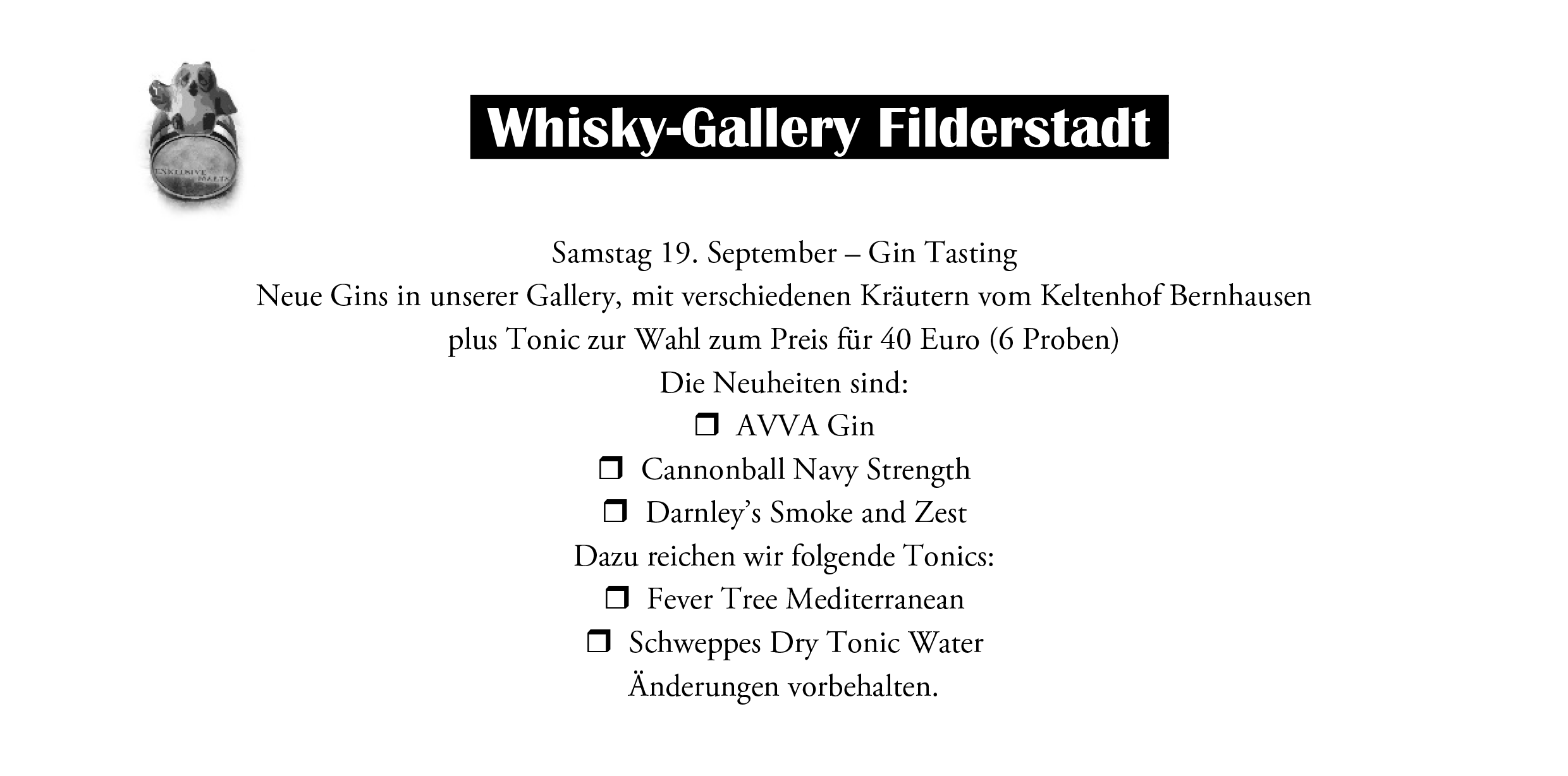 Durch die Beschränkungen der Covid-19 Pandemie ist es derzeit nur erlaubt an den Tastings durch vorherige Anmeldung teilzunehmen. Maximale Teilnehmerzahl 10 Personen. Es gelten bei allen Veranstaltungen die verordneten Hygienevorschriften. Tragen Sie deshalb einen Mund-Nasenschutz bis Sie zu Ihrem Platz gewiesen werden. Betreten Sie unsere Gallery nur einzeln.