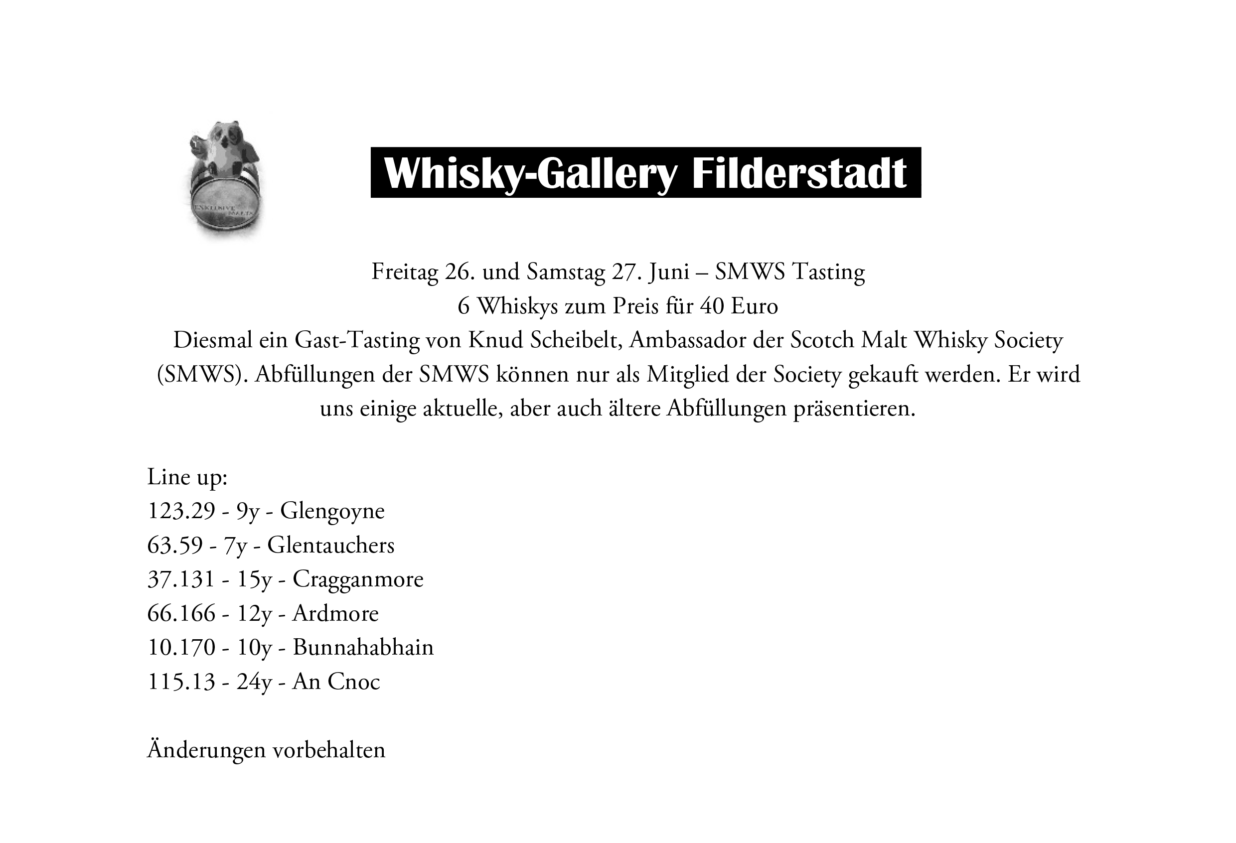 Durch die Beschränkungen der Covid-19 Pandemie ist es derzeit nur erlaubt an den Tastings durch vorherige Anmeldung teilzunehmen. Maximale Teilnehmerzahl 10 Personen. Es gelten bei allen Veranstaltungen die verordneten Hygienevorschriften. Tragen Sie deshalb einen Munschutz bis Sie zu Ihrem Platz gewiesen werden. Betreten Sie unsere Gallery nur einzeln.